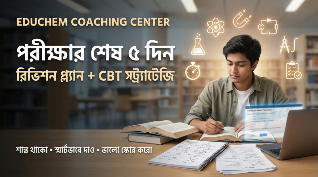 শেষ কয়েকদিন আগে পরীক্ষায় 20–30 নম্বর বাড়ানোর কৌশল: Revision Plan + CBT Strategy + Mind Control (Educhem Coaching Centre) পরীক্ষার আগে শেষ কয়েকটা দিনই আসলে সবচেয়ে গুরুত্বপূর্ণ সময়। কারণ এই সময় নতুন করে বেশি পড়া নয়, বরং যা পড়েছ—সেটা ঠিকভাবে ব্যবহার করতে পারলেই নম্বর বাড়ে।অনেক ছাত্র-ছাত্রী এই সময় ভুল করে—রাত জেগে পড়া, নতুন অধ্যায় শুরু […]