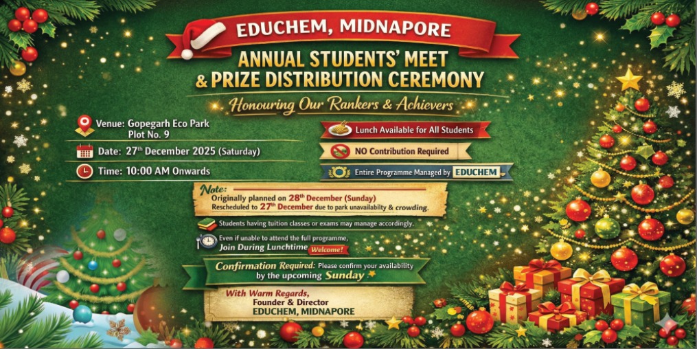 বর্তমানে Educhem Coaching Center–এর বহু শিক্ষার্থী ভারতবর্ষের বিভিন্ন রাজ্যে উচ্চশিক্ষা গ্রহণ করছে। পড়াশোনার ব্যস্ততা ও ভৌগোলিক দূরত্বের কারণে অনেক কৃতি শিক্ষার্থী অনুষ্ঠানে উপস্থিত থাকতে পারেননি।
